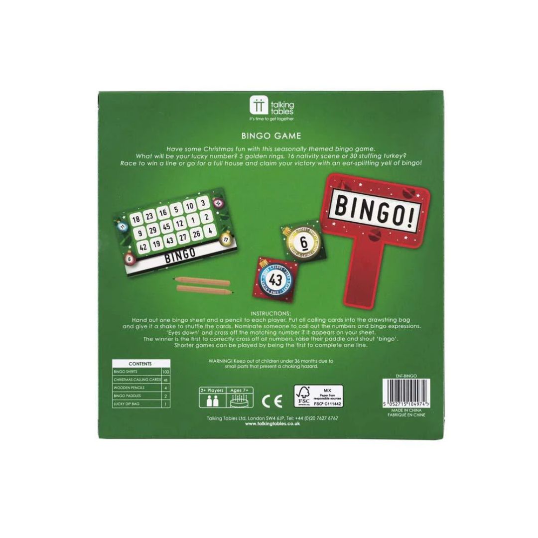 This Bingo box contains 100 Bingo sheets, 48 Christmas calling cards, 4 wooden pencils, 4 Bingo paddles and 1 lucky dip bag.