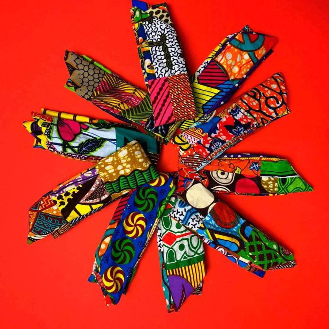 These vibrant wire headbands are created with Ankara Wax cotton fabrics.